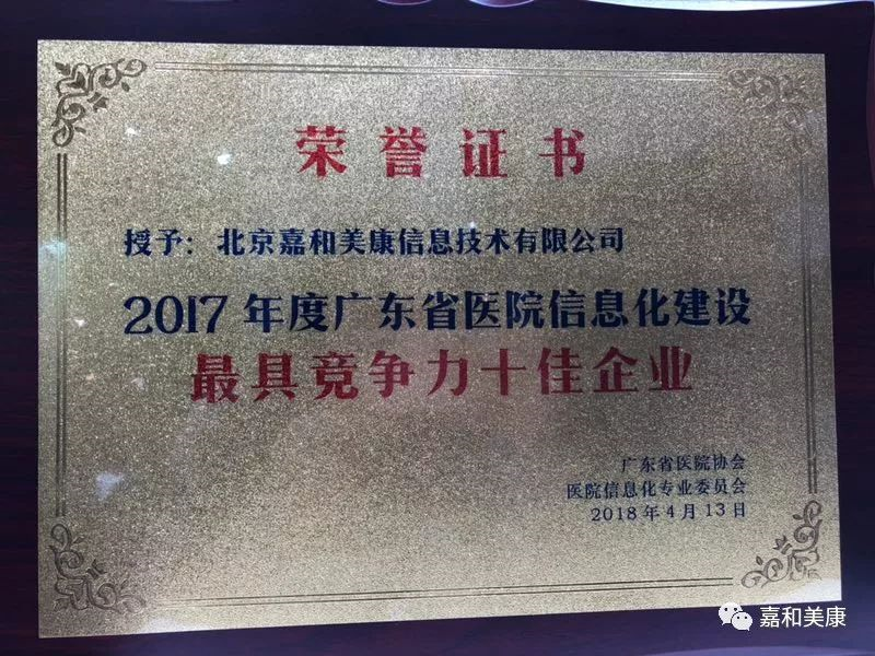 凭借业界的认可、医院的信赖等,通过组委会综合评定,嘉和美康获得“2017年度广东省医院信息化建设最具竞争力十佳企业”。奖项的获得是对嘉和美康的肯定,更是鞭策嘉和美康前进的动力。
