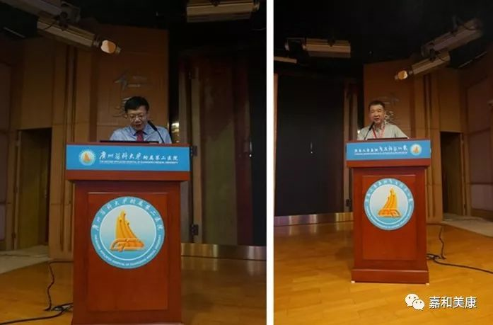12日上午,广州医科大学附属第二医院院长刘世明(左)、广东省医院协会会长黄力(右)做了精彩的开幕致辞。
